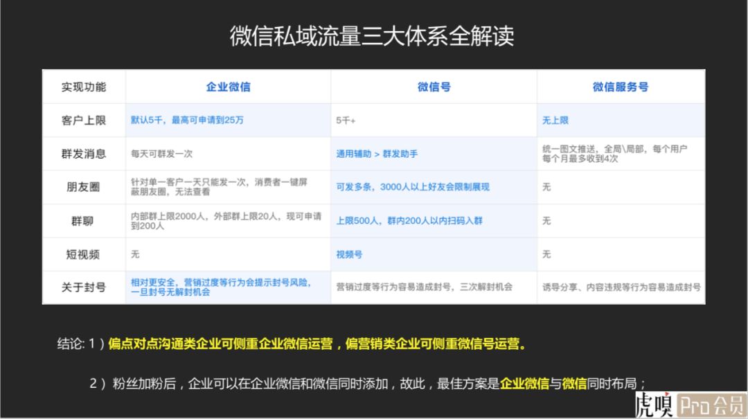 首先通过上图,了解一下三大体系的优劣点。根据微信三大体系特点,建议侧重点对点跟客人进行沟通的企业,可以重点运营企业微信;偏向营销类的企业,用微信的个人号。而最佳布局方案,是企业微信跟个人微信同时布局。如何布局4G流量这一块,不同类型的客户,布局策略会有差异。
